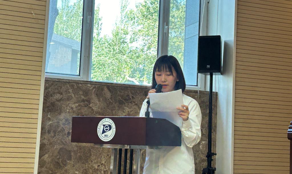 力学20-2班的刘博杰和信计20-1班的白桐菲分别作为党员宿舍员工代表和党员员工代表进行发言,倡议全体员工党员要勇于亮身份做表率,用实际行动践行党员的使命和责任,充分发挥党员的先锋模范作用,用青春风采为党旗争光添彩。