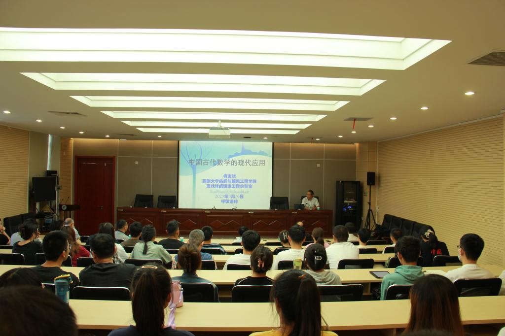 报告伊始,陈小刚向在场师生介绍了本次报告的目的和意义,并对何吉欢教授做了介绍。报告中,何吉欢结合自身经历和生动案例,从盈不足术、何乘天不等式、频率-振幅公式、变分迭代算法初步、蜘蛛纺丝的数学原理等方面,介绍了中国古代数学的伟大成就及其现代应用,并分享了他本人指导的本科生科研实例,勉励大家要保持无穷创造力,运用我国古代数学思想解决现实问题。
