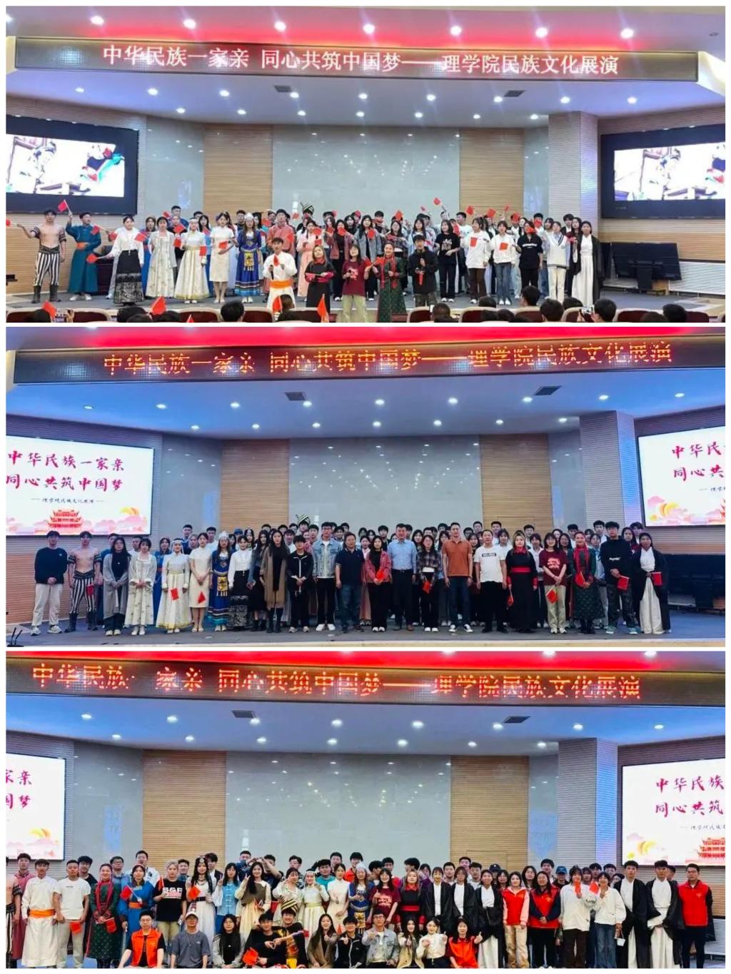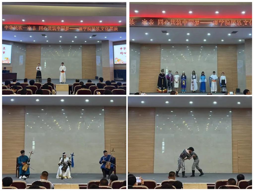 本次活动在民族服饰走秀中拉开序幕,同学们身着汉族、蒙族、苗族、藏族等民族服饰进行展示,旁白解说各民族服饰特点,让观众们感受到民族服饰的魅力的同时也加深了对不同民族的文化背景和发展历史的了解。蒙古族歌曲《女人的命运》,大屏幕上播放着蒙古族姑娘出嫁的视频,让现场师生仿佛身临其境。节目丰富多彩,有古典舞《簪花记》、中国剪纸和书法展示、马头琴演奏《美丽的草原我的家》、国术散手八卦掌和蒙古族博克的演示。还进行了各民族饮食文化的介绍,现场的师生共同品尝了奶茶、月饼、粽子等各民族特色美食。此次文艺展演在全场师生大合唱《相亲相爱一家人》中圆满落幕。