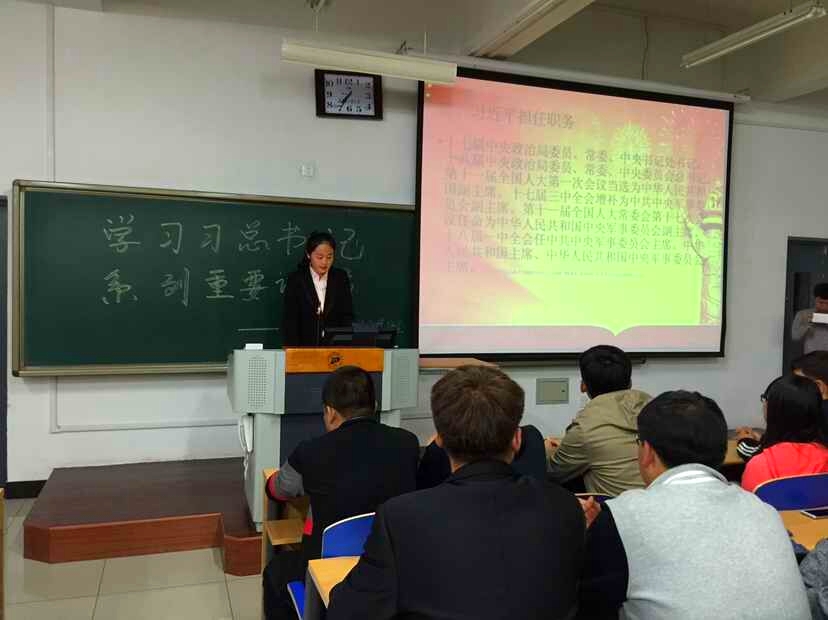 会议上,学研会会长谷帆同学为同学们播放了相关视频,视频涵盖了习近平总书记的成长历程等多个方面的内容,并向同学们介绍了“四个全面”的提出及其具体内容,随机提问了几名同学对此内容感受。随后,学研会副会长给同学们展示了几张抗战胜利七十周年大阅兵的图片,讲述了习近平总书记访美的相关内容,同学们都听得津津有味。最后本次会议在大家的掌声中圆满结束。