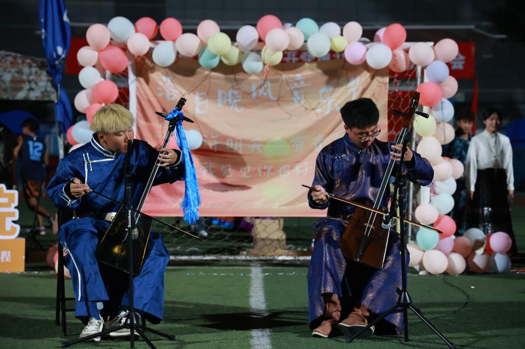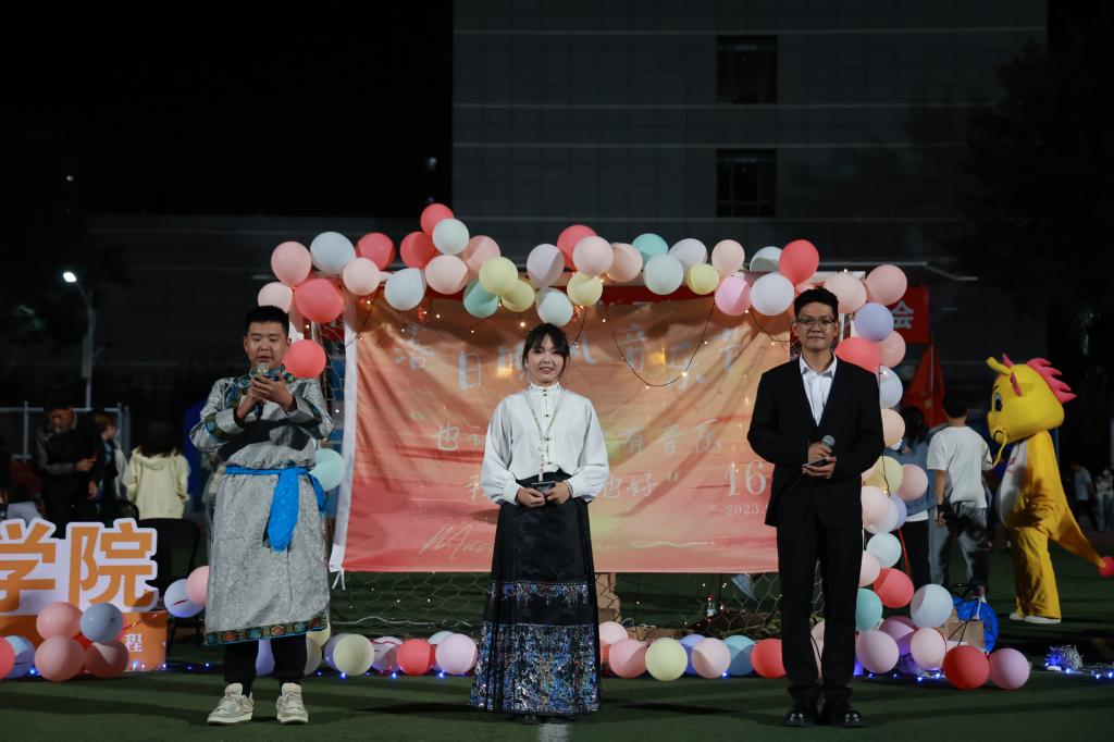 晚会在歌曲合唱《日不落》中拉开序幕,蒙古语歌曲《姑娘在远方》《有缘相爱》《一天》、汉语歌曲《你从未离去》《爱阔天空》、蒙古族舞蹈《迁徙》、汉族舞蹈《罗敷行》马头琴演奏《黑幕日》、吉他弹唱《会不会》等极具民族特色的节目,将晚会的氛围拉满,台上演员激情表演,精彩纷呈,台下观众掌声阵阵,晚会现场气氛热烈。现场布置得温馨且浪漫,同学们挥舞手中的闪光灯,热情高涨,灯光温柔地照耀着现场,氛围感满满。晚会最后在全体演员和观众合唱《相亲相爱》中落幕。
