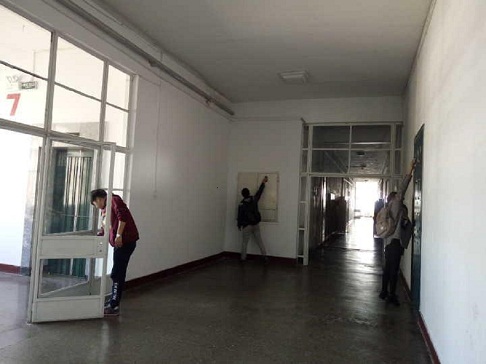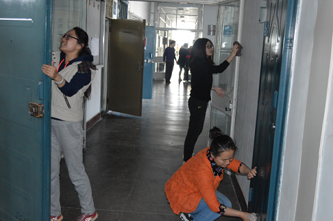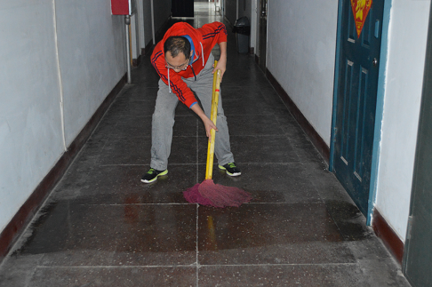 我们主要清扫实验楼的二楼到七楼,其分工主要是研究生一、二、三党支部、力学系员工党支部、物理系员工党支部及数学系员工党支部各负责一层楼的卫生。在这寒意寒意还没褪去的三月,大家拿着用凉水沾湿的抹布认真仔细的擦着门框、玻璃;拿着笤帚清扫垃圾,推着拖把清理地面。在打扫过程中,没有任何人抱怨环境有灰尘,相反大家开开心心的齐力打扫卫生,大家忙碌的身影形成了一道别样美丽的风景线。