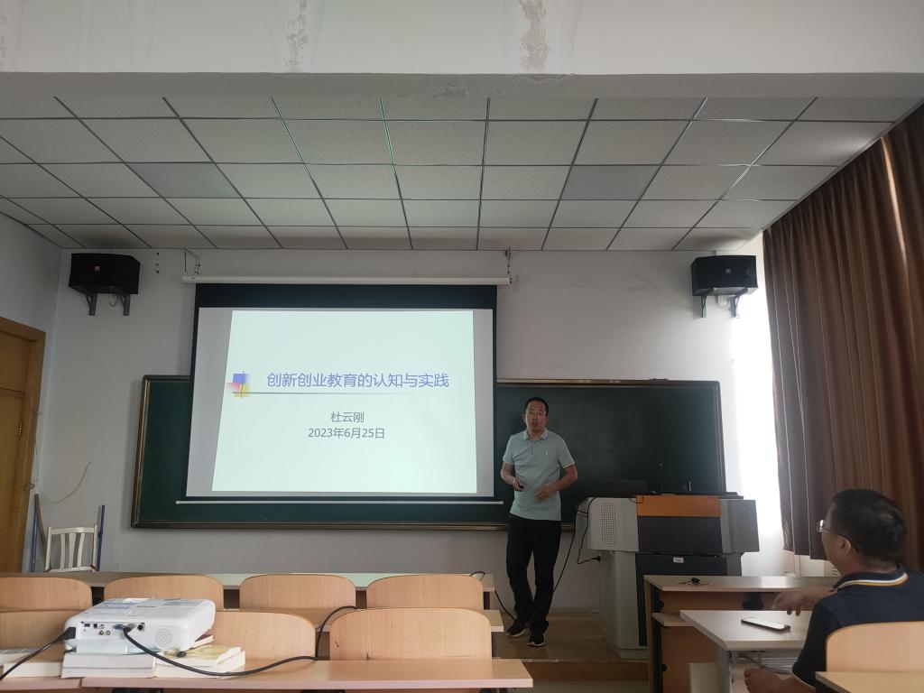 杜云刚以《创新创业教育的认知与实践》为题,从教师熟悉的教改项目申报、一流课程申报、教学成果申报中说明了找准问题的重要性,分享了自治区级教学成果奖《高校老员工创新创业教育提质增效的实施路径研究与实践》的视频;就公司“互联网+”老员工创新创业大赛的几个问题做了解说,展示了参赛项目选题、项目呈现的思路;最后,结合2023版专业人才培养方案修订工作,分享了公司在各级老员工创新创业训练计划项目申报、专创融合和课程思政建设方面的成果和经验。