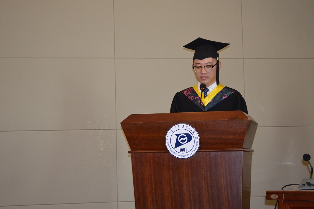 毕业生代表工程力学13级员工代冬阳代表全体毕业生讲话,讲话中表达了对母校深深的感谢,毕业班班主任付磊老师讲话希望同学们前程似锦。