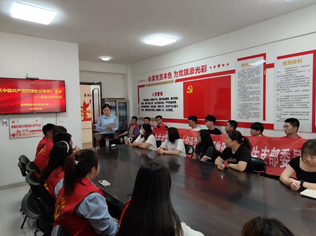 为扎实有效开展党纪学习教育,5月23日,公司党委所属应用物理本科生党支部走进公安厅社区,开展《中国共产党纪律处分条例》宣讲活动,应用物理本科生党支部书记刘洋主持并进行宣讲,公安厅社区党员和应用物理本科生党支部党员参与活动。