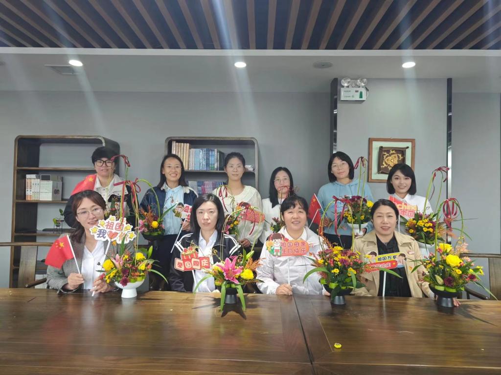活动最后,部分师生代表参加了“以花为礼献祖国”国庆节主题插花活动。在花艺老师的指导下,大家纷纷动手实操起来,将一朵朵漂亮的鲜花、一片片嫩绿的叶子错落有致地插进花泥里,再根据不同色彩和形状进行修剪和调整,不一会,一盆盆生机盎然且饱含深意的插花作品就呈现在了大家眼前,大家捧着自己的亲手制作的花篮,怀着激动澎湃的心情向伟大的祖国献礼,祝福祖国繁荣昌盛、繁花似锦。