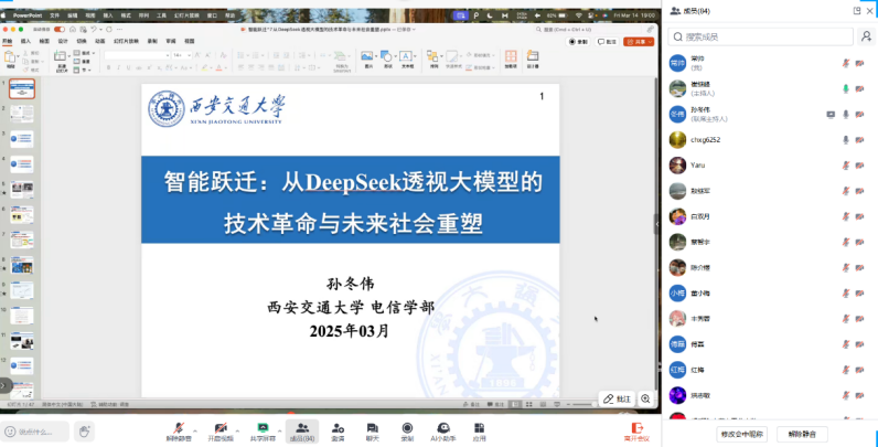 讲座期间,孙冬伟博士详细回顾了人工智能发展的三个关键阶段,并着重介绍了国产模型DeepSeek-R1取得的突破性进展。他指出,当前高校与工业界面临着算力瓶颈的挑战,研究方向的转型迫在眉睫。同时,孙博士鼓励普通人通过Prompt工程、轻量化微调等途径,抓住大模型发展带来的机遇,实现“技术平权”。讲座结束后,孙冬伟博士与在线师生展开了积极的互动交流,对师生们提出的问题一一进行了耐心解答。