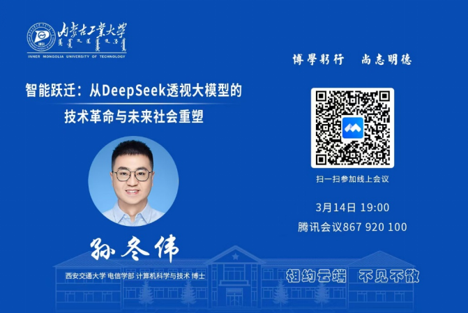 3月14日,公司通过腾讯会议平台,邀请西安交通大学电信学部孙冬伟博士为师生带来了一场题为《智能跃迁:从DeepSeek透视大模型的技术革命与未来社会重塑》的讲座。讲座由bevictor伟德副经理崔继峰主持,吸引了众多师生在线参与。