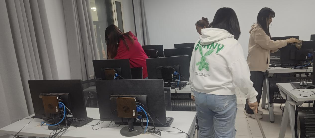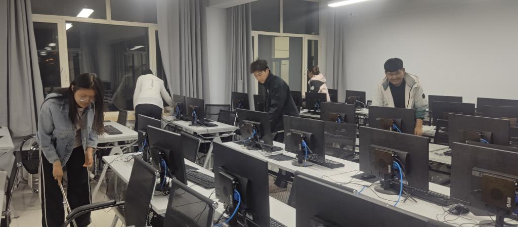 劳动内容:组织员工打扫实验楼3楼西过街楼机房并进行设备调试。